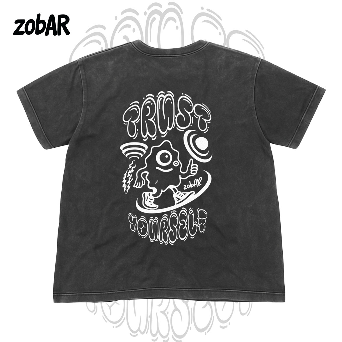 Elevate your streetwear collection with this bold acid wash graphic t-shirt featuring an original design by zobAR. Crafted from high-quality cotton for a soft, vintage-inspired feel, this tee showcases a quirky character and the empowering message: “Trust Yourself.” The hand-drawn, retro-style artwork stands out in crisp white against the dark, charcoal-black acid wash, blending nostalgic charm with modern edge. Whether you’re into art, self-expression, or just bold style, this tee is made to inspire confidence and individuality.
