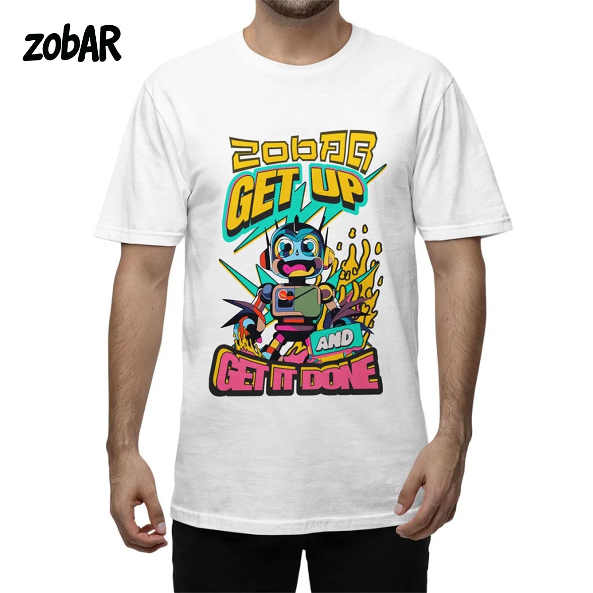 Unleash your motivation and style with the zobAR “Get Up and Get It Done” T-shirt! Designed for go-getters, this bold and energetic graphic tee features a vibrant, high-quality print of a dynamic robot character bursting with energy, accompanied by an electrifying color palette and striking typography.